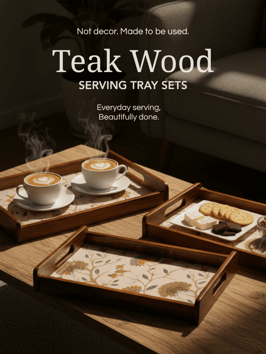 Golden Whisper Wooden Serving Tray, Set of 3, Premium Teak Wood