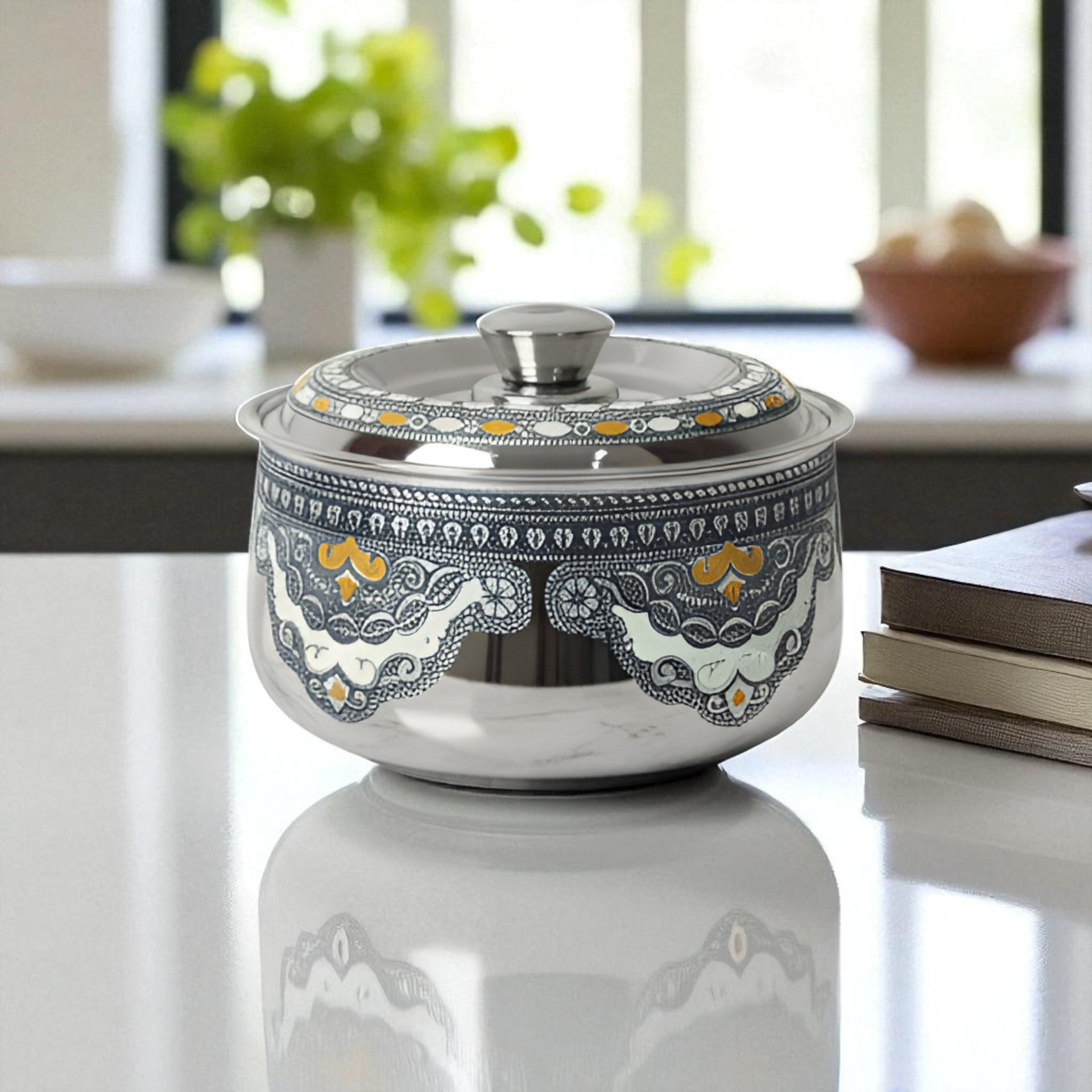 A beautifully crafted antique stainless steel casserole—also known as a roti pot—with a timeless traditional design, perfect for keeping rotis warm at family meals, enhancing festive gatherings or daily dining with elegant utility, and making a thoughtful, durable gift for loved ones.