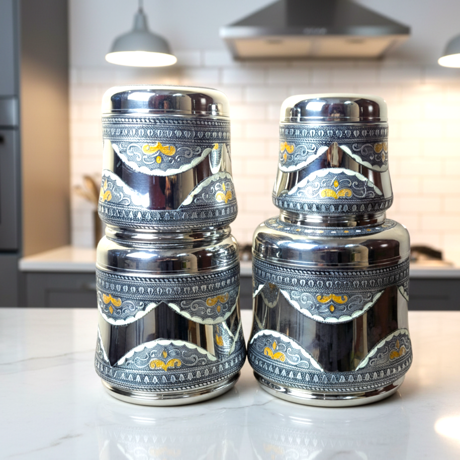 Discover the Antique Dabba Collection – a fusion of classic artistry and everyday practicality. This set of airtight stainless steel storage containers offers both durability and timeless elegance. Made from BPA-free, food-grade stainless steel, these dabbas are shatterproof, dent-resistant, and ideal for long-term storage of grains, pulses, snacks, or festive treats. Available in four convenient sizes – 3.25L, 2.5L, 1.75L, and 1.25L, they nest perfectly for space-saving storage and are adorned with intricate etching for a refined traditional touch. Whether used in your kitchen or gifted during special occasions, this collection reflects both utility and heritage charm in every curve.