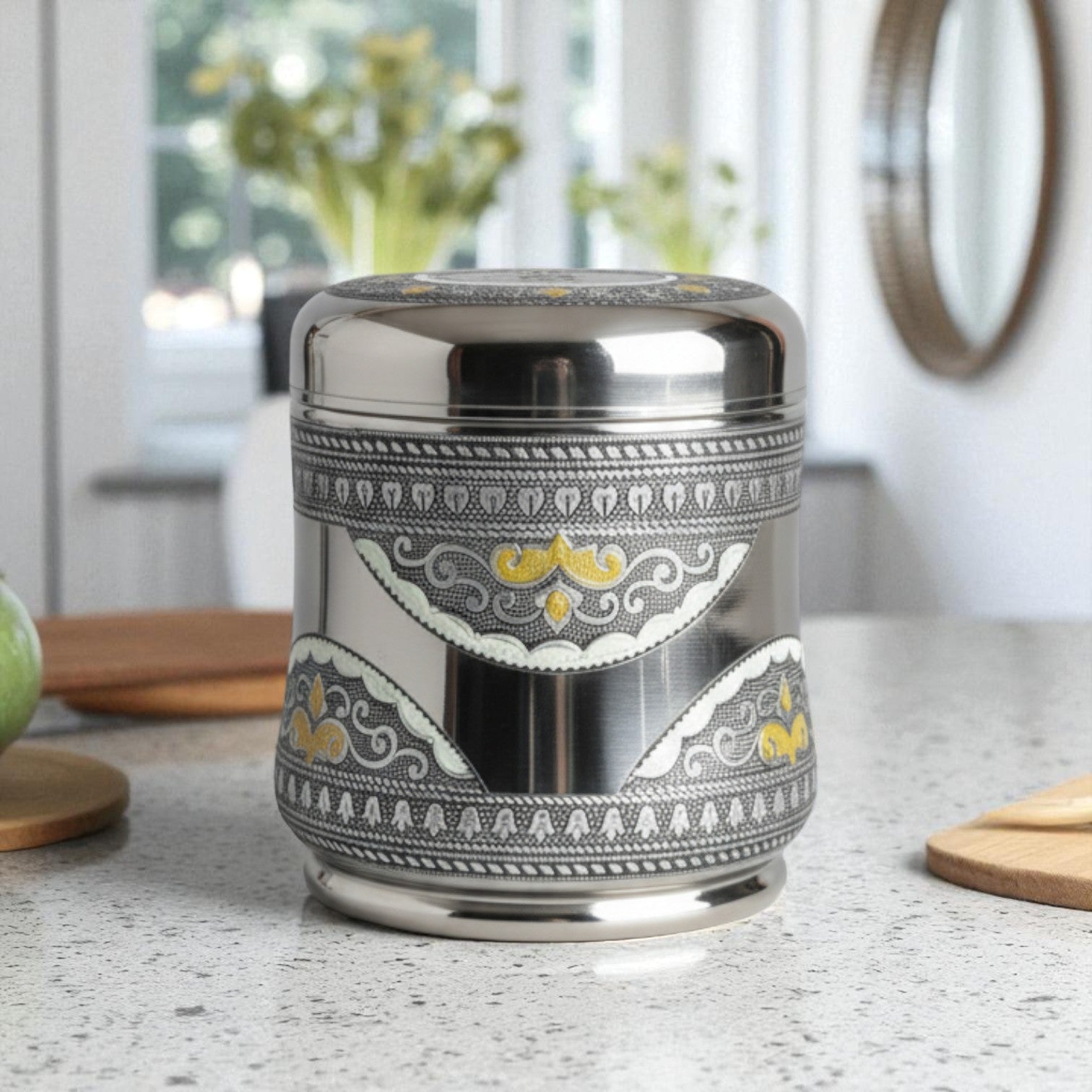 A beautifully designed stainless steel dabba with a timeless etched pattern—perfect for storing grains, snacks, or festive treats, and a meaningful addition to your kitchen or gifting occasions.
