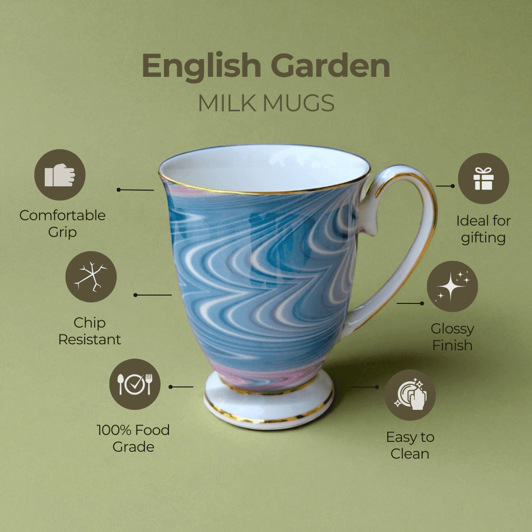 Introducing the English Garden Milk Mug in Royal Vortex design – a timeless ceramic classic. This elegant 300ml mug brings a touch of calm sophistication to your table. Designed with a serene marbled finish and high-gloss glaze, it’s as beautiful as it is practical. Crafted from 100% food-grade ceramic, the mug is chip-resistant, ensuring long-lasting use. The comfortable, easy-grip handle prevents slipping, while the smooth surface makes it effortless to clean. Ideal for sipping your morning milk, tea, or coffee—and equally perfect as a thoughtful gift.