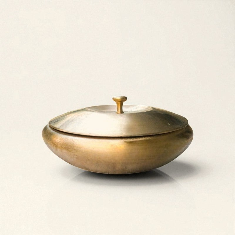 • Artisanal Hammered Accent: The lid bears delicate hammer-textured detailing that plays beautifully against the handi’s smooth, lathe-turned body—highlighting the fusion of traditional repoussé work and precision spinning.