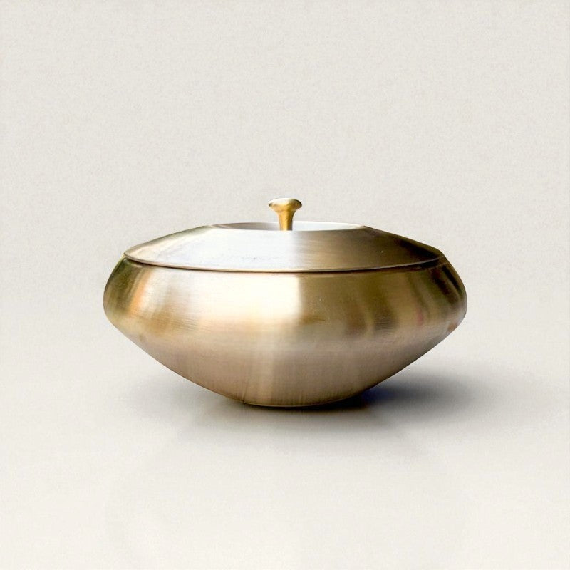 • Hand-Hammered Lid Detail: The lid’s subtle hammer-textured surface contrasts beautifully with the handi’s smooth, lathe-turned base—showcasing the dual mastery of artisan repoussé and precision spinning.