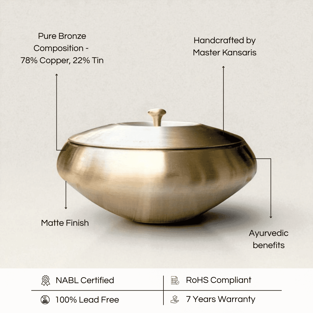 • Eco-Conscious & Chemical-Free: Crafted entirely from recyclable bronze without lacquers, paints, or plastic linings, it aligns with India’s zero-waste ethos and ensures pure, untainted flavors.