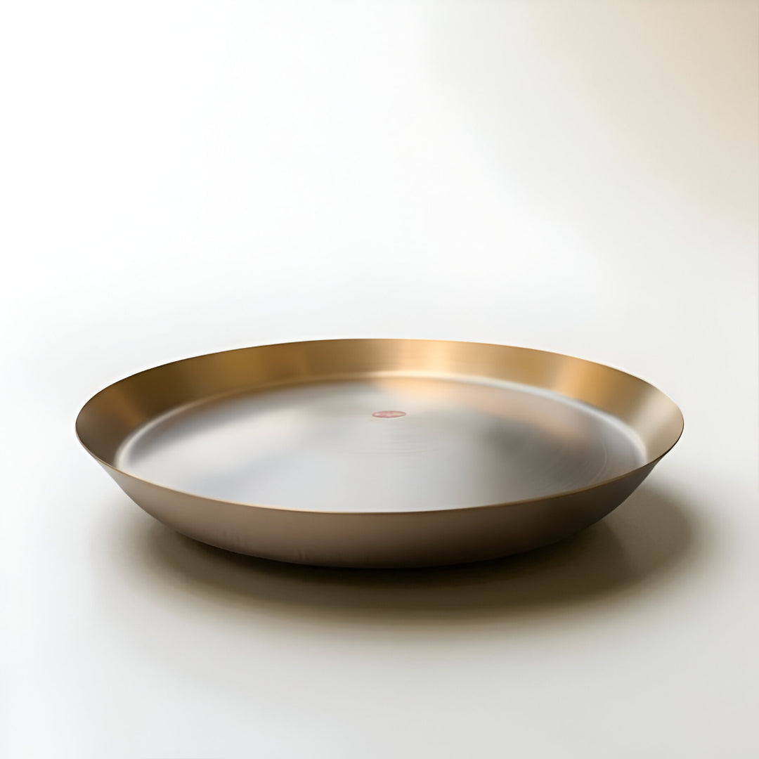 This 11-inch bronze thali features a pristine, smooth surface with a subtle, timeless sheen, perfect for serving a traditional Indian meal.