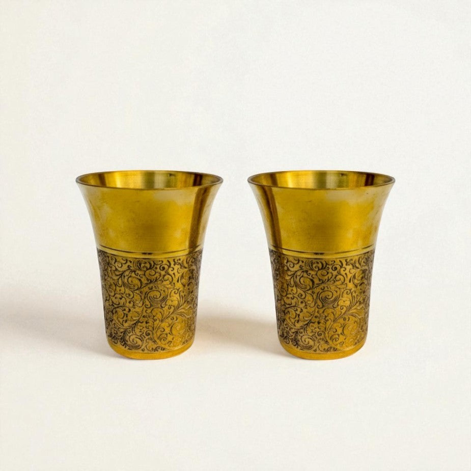 Introducing the pair of Heritage brass glasses, crafted from pure brass with an etching based finish that brings traditional charm to modern living. Made by the best handcrafted artisans in the brass capital of India, Moradabad, by Lily. Brass is scientifically proven to act as a natural anti-microbial agent and purifying water. Available exclusively at CarryHome.